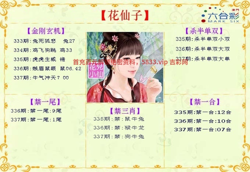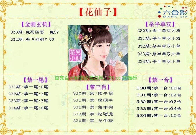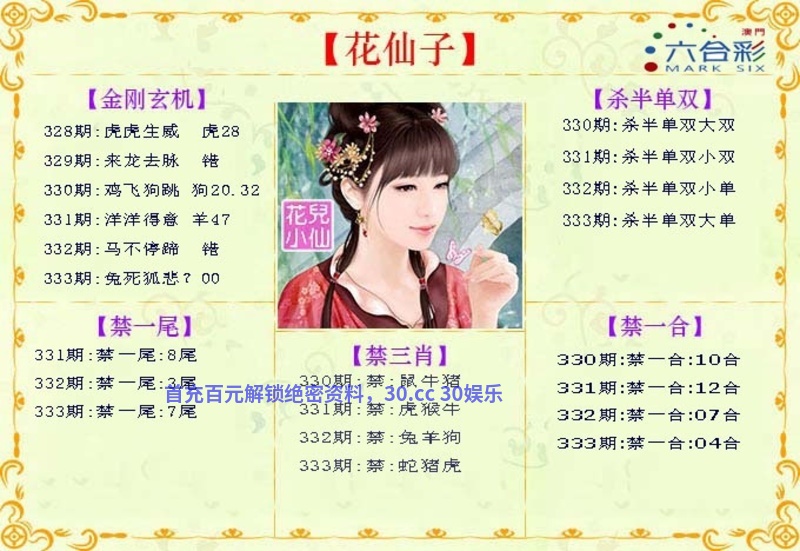【花仙子解传真】331期:本期生肖一二开,二三门看特有钱。江南美女娇女娇,合得好码送大家。东宫夫人找奴才,头蓝尾绿特码家。虎头蛇尾不用取,白姐相送买二七